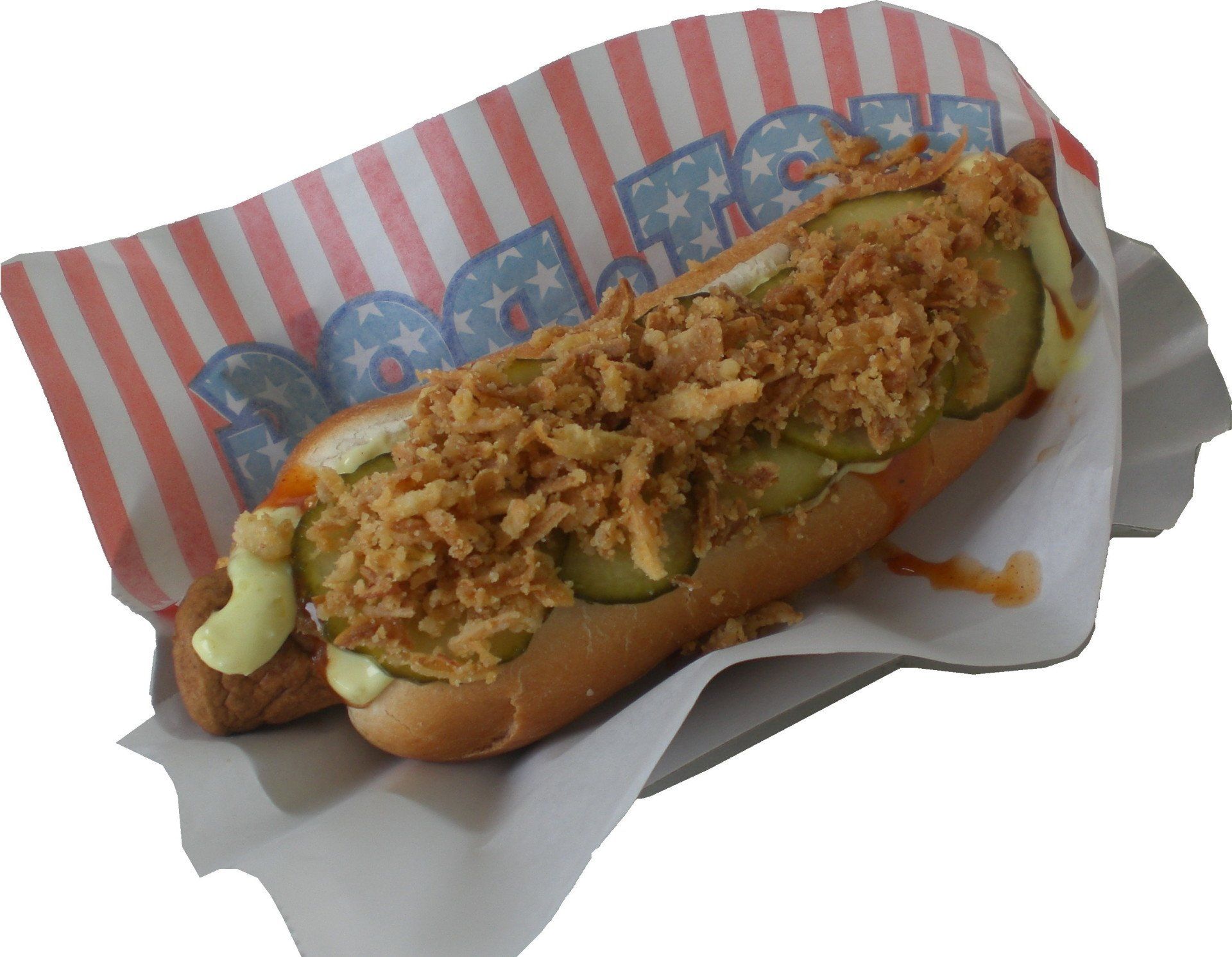 mit Ketchup, Dansk Dressing, Gurken und Röstzwiebel